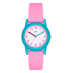 Color Pop! Diese schöne Armbanduhr der Marke Cool Time lässt nicht nur die Herzen von Kindern und Jugendlichen höherschlagen. Neben dem mit viel Liebe zum Detail entworfenen Colorblocking-Design wurde bei der Entwicklung auch auf die Qualität besonders viel Wert gelegt. So ist die Kinderuhr mit Sillikonarmband schadstoffgeprüft, widerstandsfähig, abwaschbar und sehr komfortabel zu tragen. Dank klarer Zahlen und präzisen Minuteneinteilungen wird das Erlernen der Uhrzeit zum Kinderspiel. Ein zuverlässiges Quarzwerk und kratzunempfindliches Mineralglas runden die Uhr optimal ab. Verpackt im coolen Mäppchen ist die Uhr ein ideales Geschenk und sorgt auch in der Schule für "Cool Time".