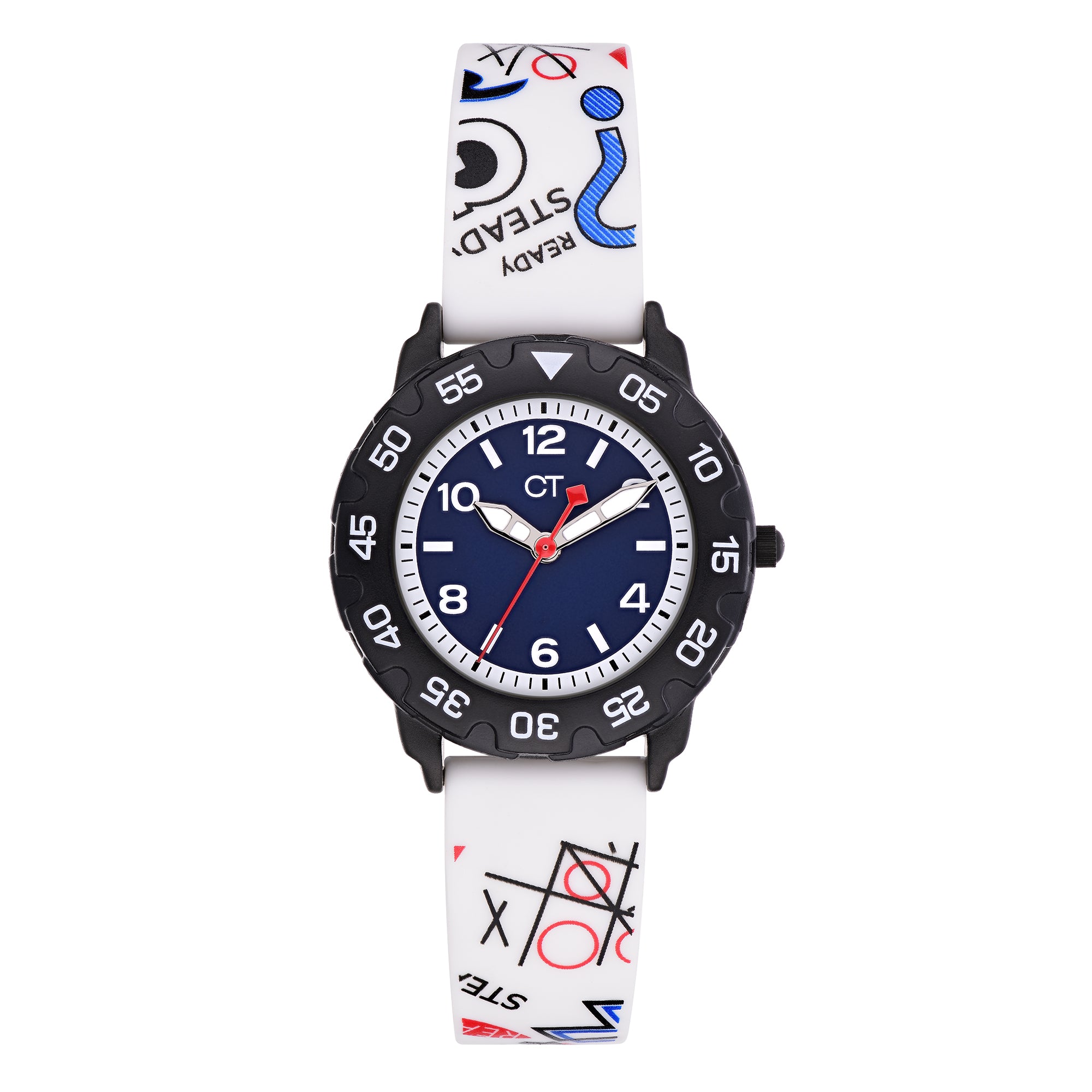 Diese sportlich-coole Kinderuhr mit drehbarem Topring der Marke Cool Time ist für jedes Abenteuer bereit und macht den Schulstart kinderleicht. Neben dem coolen "Back to School"-Design wurde bei der Entwicklung auch auf die Qualität besonders viel Wert gelegt. So ist die Kinderuhr mit Sillikonarmband schadstoffgeprüft, widerstandsfähig, abwaschbar und sehr komfortabel zu tragen. Dank klarer Zahlen und präzisen Minuteneinteilungen wird das Erlernen der Uhrzeit zum Kinderspiel. Ein zuverlässiges Quarzwerk und kratzunempfindliches Mineralglas runden die Kinderuhr optimal ab. Verpackt im coolen Mäppchen ist die Uhr ein ideales Geschenk und sorgt auch in der Schule für "Cool Time".